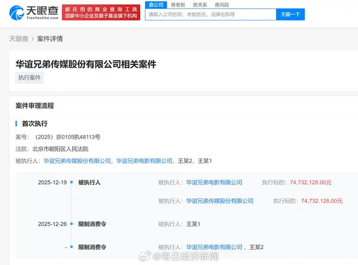 据天眼查官网显示,近日,华谊兄弟旗下两家核心公司华谊兄弟电影有限公司、华谊兄弟传媒股份有限公司及其法定代表人王忠磊、王忠军被北京市朝阳区人民法院限制高消费,涉及7473万元执行案件。